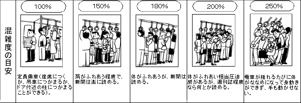 電車内で乗り合わせる人は知らない人ですから、基本的には社会距離や公共距離が許容できる距離といえるのではないでしょうか。では電車でどれほど他人と距離を置けるのか、混雑率から見てみましょう。