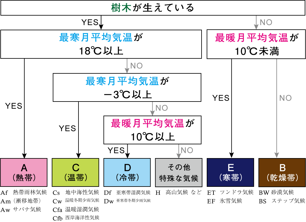ケッペンは植物の生育に障害となる最寒月の平均気温・降水量の乾燥限界・乾期の有無などをもとに、まずは気候を大きく五つに区分しました。彼の言うところを簡単にまとめてしまうと下図のとおりです。