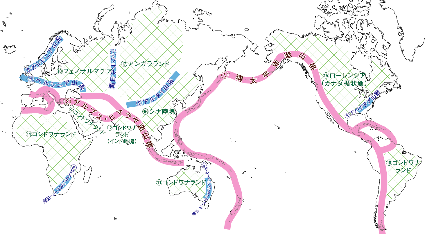 ③カレドニア山系 ④ヘルシニア山系 ⑤アパラチア山脈 ⑥グレートディヴァイディング山脈 ⑦ウラル山脈 ⑧ドラケンスバーク山脈 ⑨アルタイ山系 |