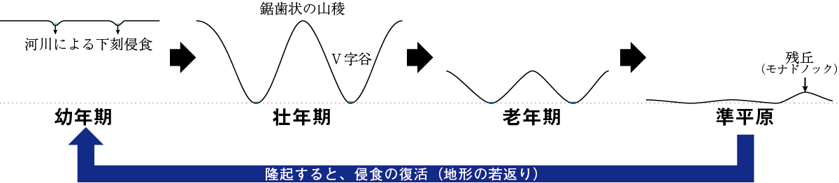 準平原が内的営力により海面より高い位置へ隆起し、②にもどる。(地形の若返り)