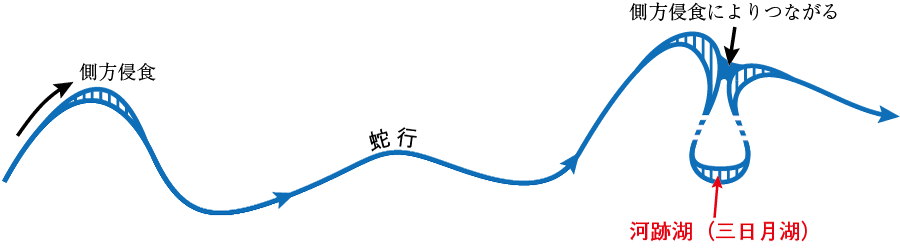 ①下刻侵食力を失った川が、隆起することによって再び侵食力を取り戻す。