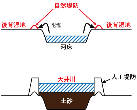 自然堤防の上に人工的な堤防が作られ、土砂が外へ排出できなくなると、河床上に土砂が溜まり