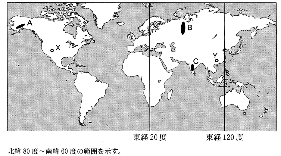 1. 次のア~ウの文は、図1中のA~Cに位置するいずれかの山脈や高原にみられる地形の特徴を述べたものである。ア~ウとA~Cとの正しい組み合わせを、1~6のうちから一つ選べ。