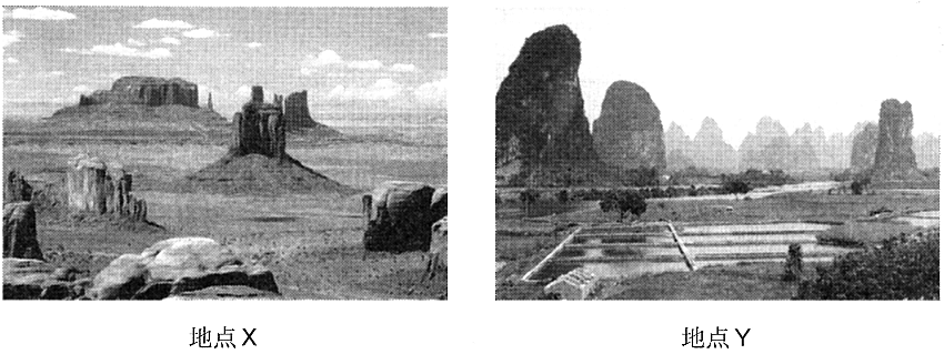 2. 世界各地では、その土地の気候条件や地質条件によって異なる侵食作用がはたらき、多様な地形がみられる。次の写真1は、それぞれ図1中の地点XとYで撮影されたものである。写真1にみられる地形を説明した下の文章中の空欄エとオに当てはまる語句の正しい組み合わせを、下の1~4のうちから一つ選べ。
