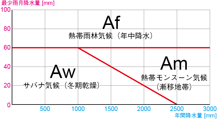 | w(冬期乾燥)型 | 最多雨月が夏にあり、 最少雨月降水量×10 < 最多雨月降水量 |